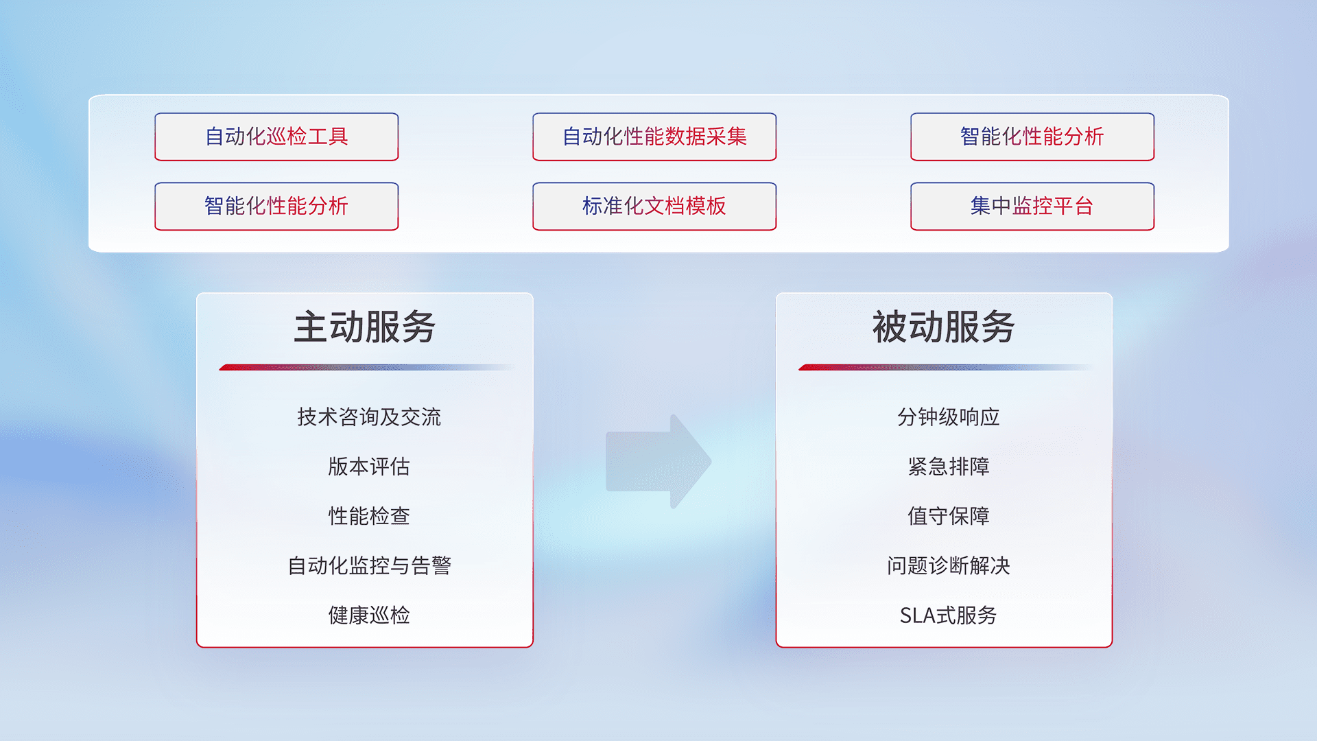 智能化工具和标准化文档,,,保障服务质量,,,提供主动服务(包含技术咨询、、版本评估、、、、性能检查、、自动化监控与告警、、、、健康巡检)和被动服务包含(分钟级响应、、、、紧急排障、、值守保障、、、问题诊断解决、、、SLA服务)。。